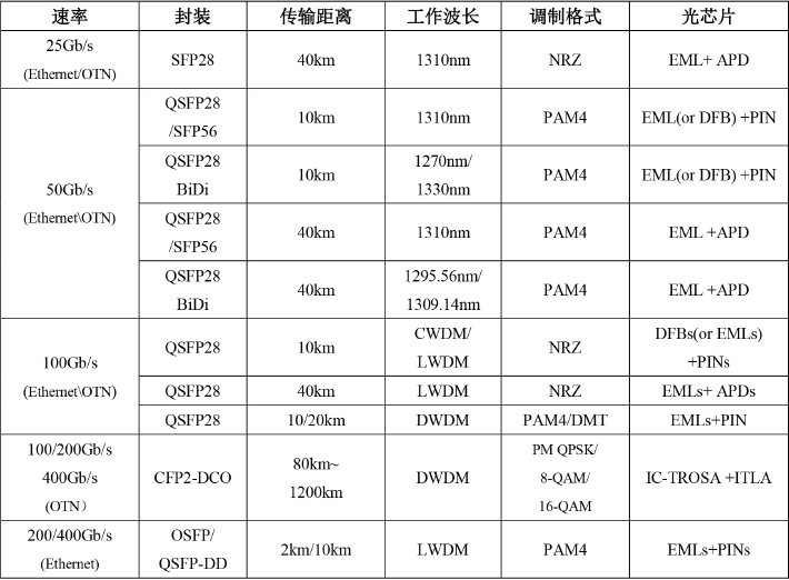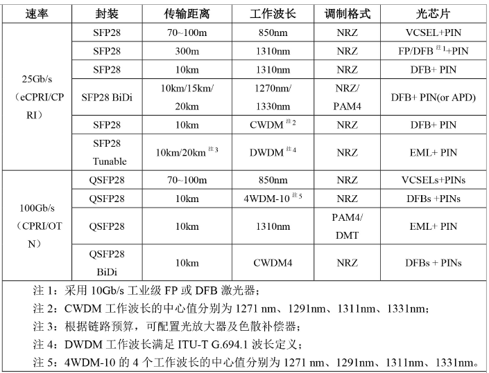 5G中回传光模块主要包括25Gb/s、50Gb/s、100Gb/s、200Gb/s、400Gb/s等多种速率,典型传输距离从几km到数百km,支持CPRI、eCPRI、以太网、OTN等多种接口协议,以及NRZ、PAM4、DMT等调制格式,具体技术现状如表3所示。
