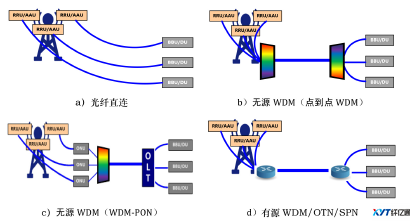 5G前传的典型应用场景如图2所示,包括光纤直连、无源WDM和有源WDM/光传送网(OTN)/切片分组网(SPN)等。光纤直连场景一般采用25Gb/s灰光模块,支持双纤双向和单纤双向两种类型,主要包括300m和10km两种传输距离。无源WDM场景主要包括点到点无源WDM和WDM-PON等,采用一对或一根光纤实现多个AAU到DU间的连接,典型需要10Gb/s或25Gb/s彩光模块。有源WDM/OTN场景,在AAU/DU至WDM/OTN/SPN设备间一般需要10Gb/s或25Gb/s短距灰光模块,在WDM/OTN/SPN设备间需要N×10/25/50/100Gb/s等速率的双纤双向或单纤双向彩光模块。