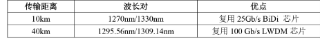 对上下行时延对称性要求较高的应用场景可采用50Gb/s BiDi光模块,相关标准IEEE 802.3cp正在规范,拟采用WDM技术方案,结合方案成本与供应链成熟度考虑,具体波长对选择建议如表1所示。