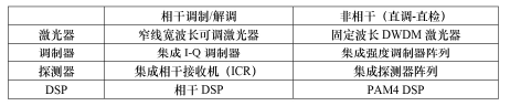 非相干DWDM彩光模块的典型传输距离为40km及以内,目前主流方案采用PAM4技术。非相干50/100Gb/s光模块采用固定波长DWDM激光器和PAM DSP芯片,相对于相干光模块具有一定的成本优势,两者关键器件的比较如表4所示。