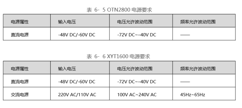 OTN2800 的电源要求参见表 6- 5 和表 6- 6。
