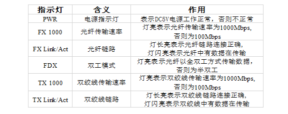 如上图所示,纤亿通常见的光纤收发器共有6个指示灯,每个指示灯分别代表如下表所示: