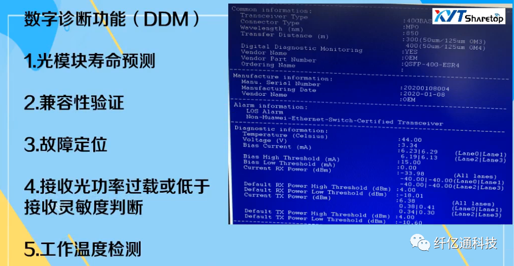 带DDM(光模块的数字诊断监控接口)功能系统的光模块提供一种性能监测手段,可以预测光模块的使用寿命。