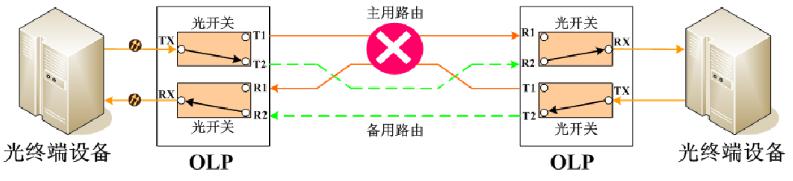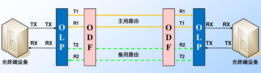 OLP前端对接要保护的数据,在出站点光纤之前,后端对光纤线路进行保护。即在出站点之前能切换至不同的管道,管道即是主备光缆。