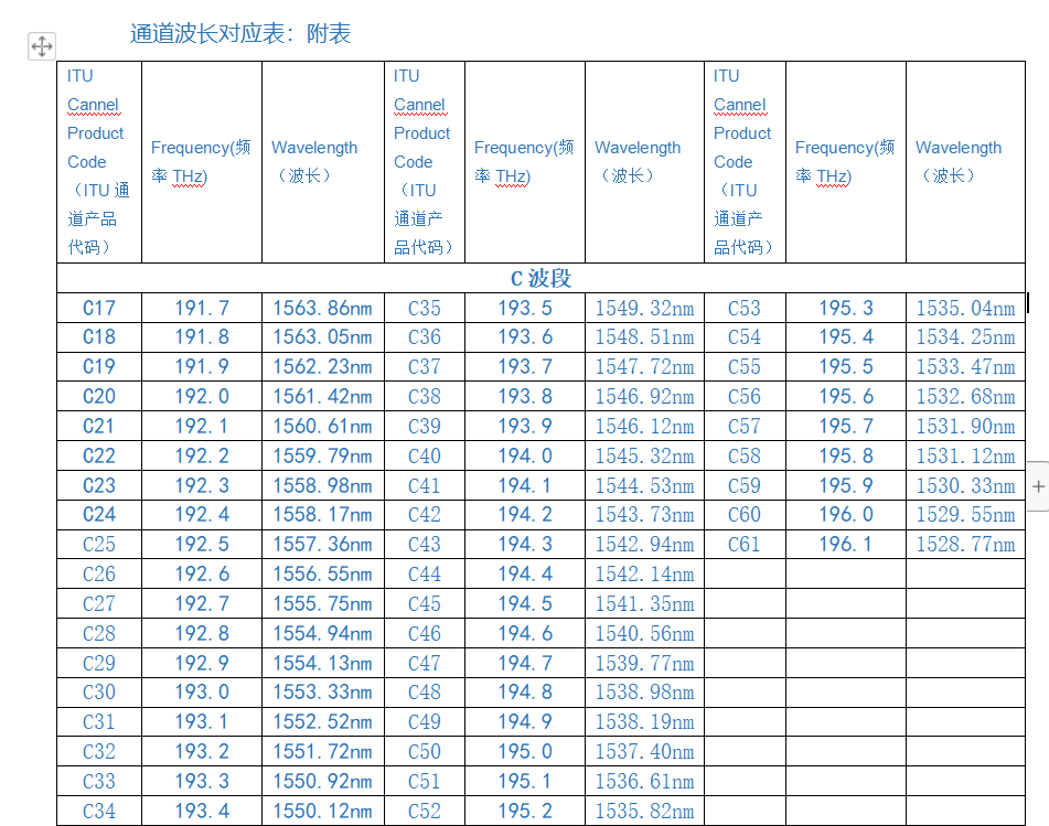 DWDM CH17~CH61 L62~L09 50GHZ信道间隔约0.4nm、100GHZ信道间隔约0.8nm、200GHZ信道间隔约1.6nm.