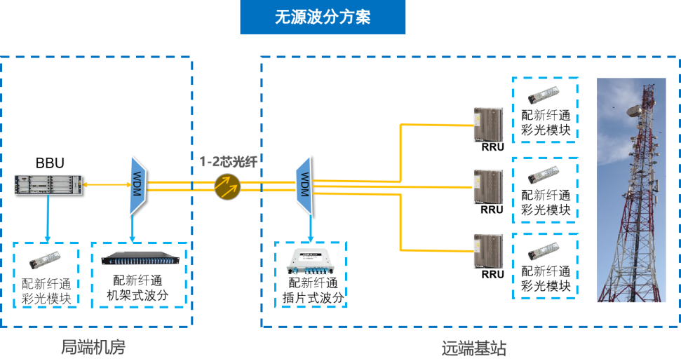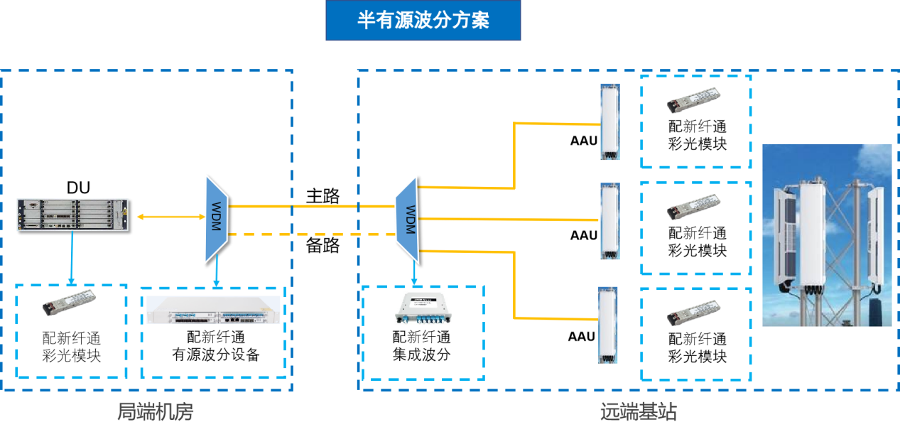 4G/5G基站建设最重要的光传输就是基站前传。基站前传主要有几种常见的方案:光纤直驱方案、无源波分方案、半有源波分方案、有源波分方案。其中4G基站主流方案是无源波分方案,5G基站主流方案是无源波分方案+半有源波分方案。