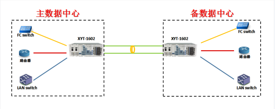 纤亿通科技根据中原银行的需求提供“大容量、高安全、低时延、多业务”的金融数据中心灾备传输解决方案。两个数据中心之间通过波分设备,实现同城数据中心互联、实时备份,保障业务连续性,从而达到规避断纤、地震等不可抗力因素对某银行业务的影响。组网拓扑如下图所示: