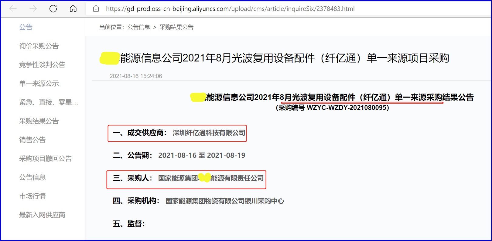 2021年,国家能源集团新一轮光波复用设备的采购中,纤亿通科技成为了单一供应商。这标志着纤亿通科技的光传输产品和光传输解决方案在政企专网当中应用越来越广泛,而且获得市场的高度认可。