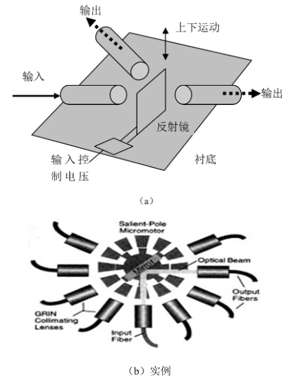 传统机械光开关的工作原理:通过热、静电等动力,旋转微反射镜,将光直接送到或反射到输出端。特点是开关速度比较慢、性价比好,在很多领域有市场前景,但体积大、不易规模集成的缺点限制了其在未来光通信领域的应用。在此基础上,近几年发展很快的是光开关,它是微机电系统和传统光技术相结合的新型开关,特别是具有光信号的数据格式透明、与偏振无关、差损小、速度快、容易集成的优点图(a)给出了一个MEMS开关的原理,(b)给出了相应的实例。