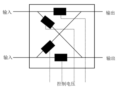 电光效应光开关多由光电晶体材料(如LiNbO3或其他半导体材料)波导材料制成,两条波导通路连接成干涉结构,外加电压可改变波导材料的折射率,从而控制两臂的相位差,利用干涉效应实现了光的通断。它的特点是速度快,但与偏振有关,成本较高。工作原理如图所示。