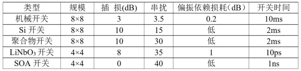 光开关性能参数有多种,如:快切换速度、高隔离度、小插入损耗、对偏振不敏感及可靠性,不同领域对它的要求也各不相同。其种类有保护、切换系统中常用的传统光机械开关,也有这几年飞速发展的新型光开关,如:热光开关、液晶开关、电光开关、声光开关、微光机电系统光开关(MOEMSmicro optic electro mechanical systems)气泡开关等。在超高速光通信领域,还有马赫曾德尔(Maeh-Zehnder)干涉型光开关、线性环路镜(NOLMnonlinear optical fiber loop mirror)光开关等光控开关。