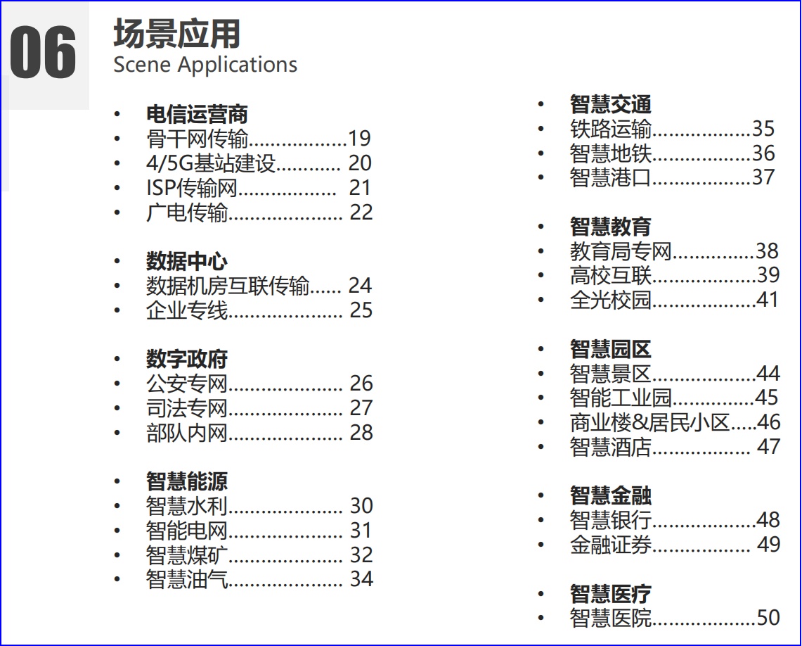 经过不断的发展,纤亿通应用场景也在不断地延伸扩展,延伸出包括数字政府、智慧能源、智慧交通、智慧教育、智慧园区方面等在内的大场景应用。例如数字政府方面,纤亿通深耕政企专网多年,案例丰富,拥有完善的公安专网传输方案和专网光传输产品,服务于智慧政企专网、消防监控传输网、天网监控传输网。智慧能源方面,纤亿通科技的智慧水利光传输方案可以为水务局搭建智能管理传输网。智慧煤矿和智能油气方面,搭建内网,可以成功实现数字化组网,业务管理协同化、信息共享的作用。在智慧教育方面,构建高校互联和全光校园方案,实现教学资源信息共享。智慧园区方面,构建园区全光网络,提升工业区管理,打造更智慧的园区等。