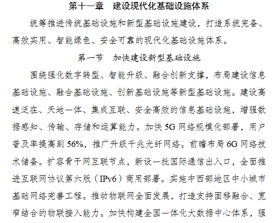 围绕强化数字转型、智能升级、融合创新支撑,布局建设信息基础设施、融合基础设施、创新基础设施等新型基础设施。建设高速泛在、天地一体、集成互联、安全高效的信息基础设施,增强数据感知、传输、存储和运算能力。加快 5G 网络规模化部署,用户普及率提高到 56%,推广升级千兆光纤网络。前瞻布局 6G 网络技术储备。扩容骨干网互联节点,新设一批国际通信出入口,全面推进互联网协议第六版(IPv6)商用部署。实施中西部地区中小城市基础网络完善工程。推动物联网全面发展,打造支持固移融合、宽窄结合的物联接入能力。加快构建全国一体化大数据中心体系,强化算力统筹智能调度,建设若干国家枢纽节点和大数据中心集群,建设 E 级和 10E 级超级计算中心。积极稳妥发展工业互联网和车联网。打造全球覆盖、高效运行的通信、导航、遥感空间基础设施体系,建设商业航天发射场。加快交通、能源、市政等传统基础设施数字化改造,加强泛在感知、终端联网、智能调度体系建设。发挥市场主导作用,打通多元化投资渠道,构建新型基础设施标准体系。
