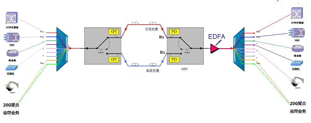 如图所示:我们通过波分设备将多种不同业务ATM/SDH/路由器/交换机/监控摄像头等不同业务融合进1芯或者两芯光纤传输,光缆距离过远我们就增加放大设备,光缆保护我们通过OLP来实现主备自动切换,当其中1芯或者2芯光缆出现故障,通过我们的OLP光保护设备可以实现15ms内自动切换,不影响业务。
