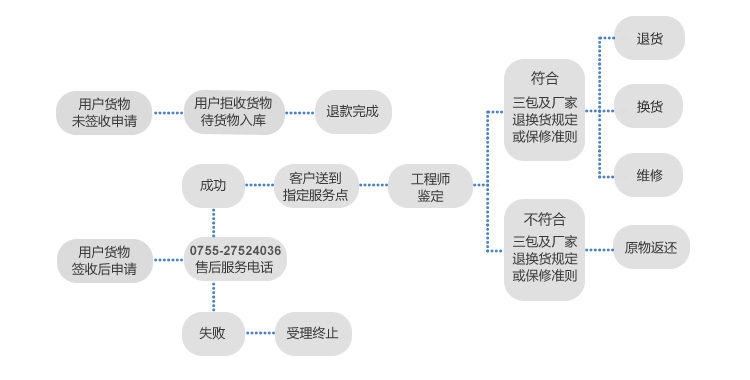 若用户您已经签收,请您直接拨打0755-27524036售后服务电话进行派单处理,则需要您送到或邮寄到指定地点进行鉴定,由纤亿通工程师进行鉴定,根据鉴定结果在退换货规定或保修准则内为您处理。