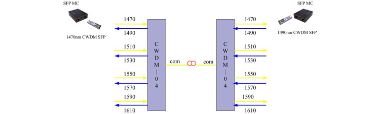 由于资源限制若只有一芯光纤,但又有带宽扩容的需要,可以采用不同波长作为收发。因此,可以在一芯光纤上实现4通道。此种方式两段选择的设备需要选择不同波长的CWDM模块。