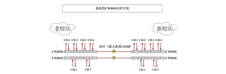 下图是CWDM系统应用于某高校的案例,其老校区网络中心为省网的节点,资源充足;新老校区距离40km,租用当地运营商一对光纤。客户要求在一对光纤上扩容出6路双向数据业务,每路速率2.5G。