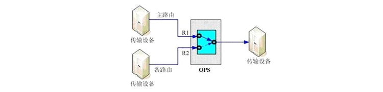 在每个节点进出两端接入我公司OPS-1-1光路保护自动切换仪,当主路由光纤发生故障时,能自动监测识别,将传输业务整体切换到备用光纤,切换时间小于15ms,完全不影响业务的传输。切换原理图如下: