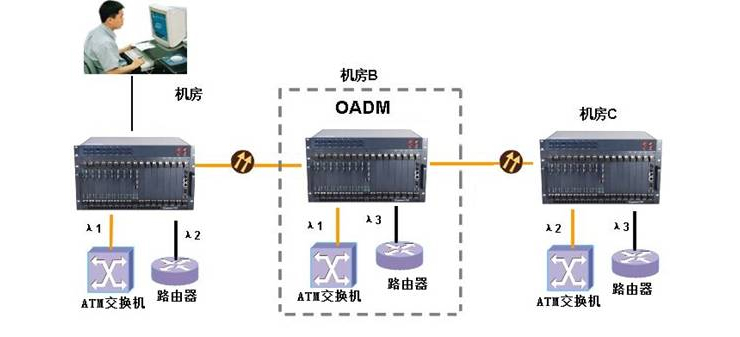 采用波分复用终端设备(MUX/DMUX)和光分插复用设备(OADM)配合,上下几路波长,构架出城域光通信中的链状网络