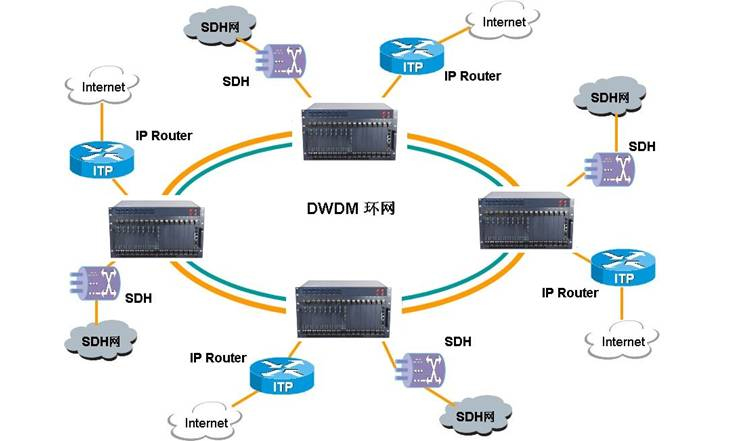 利用多个波通道在双纤资源中实现业务对称环网,主路由业务中断,业务自动切换至备用路由,实现业务侧和复用段组环保护,保证业务稳定传输,提高了系统的稳定性,同时DWDM各通道相互独立,相互通讯无干扰,提高业务容量,节省光纤资源的同时,保证了业务信号的安全性、稳定性,充分体现波分复用的优势.