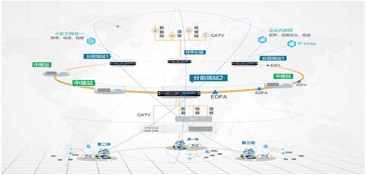 Internet宽带接入、有线电视广播(CATV)接入和IP电话三网合一光纤到家(FTTH)解决方案组网方式。