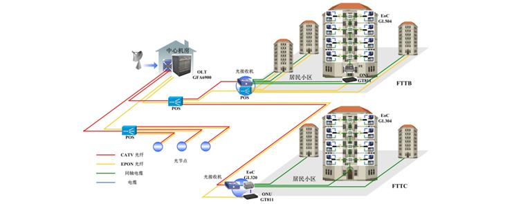 EPON点到多点的网络结构与某运营商网络很类似,同时EPON天然的广播机制使其非常适合承载视频业务。GWD针对某运营商网络提出EPON+EOC双向改造解决方案。