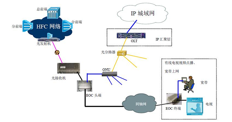 CMTS +CATV的改造方案需要对原有HFC网络进行大规模的双向改造,包括上行光纤、电放大器的双向改造、增加上行光发射机等,改造的工作量和投入成本都非常大。