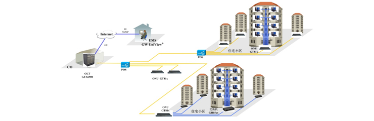 该方案采用纤亿通EPON产品,局端机房放置OLT系列设备,光纤到小区后通过光分路器接到远端用户所在的住宅小区,通过放置在楼道箱内的集成交换的ONU连接位于楼道的交换机提供多路以太网接入。