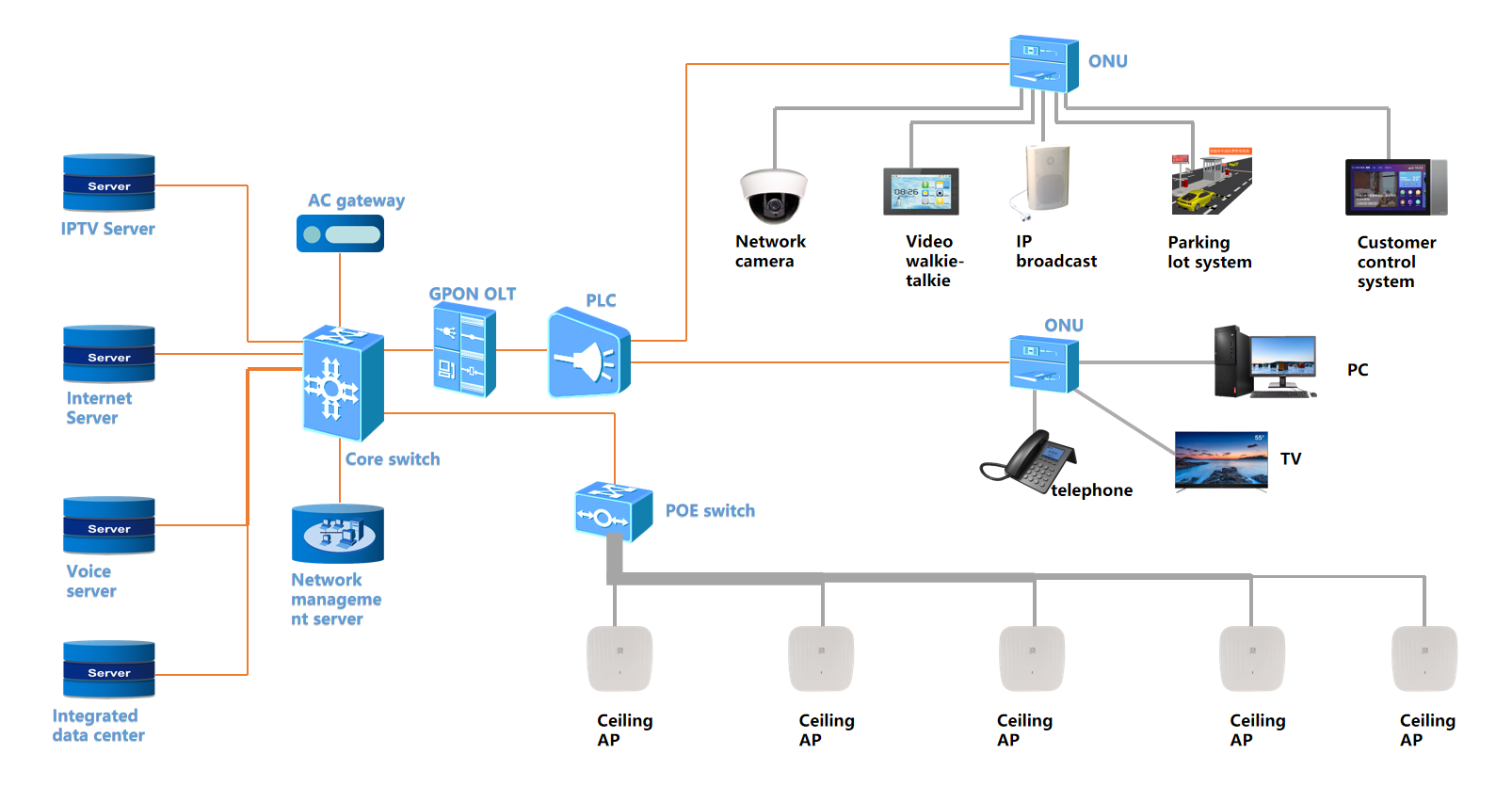 The All-optical network scheme of commercial complex developed by SHARETOP is mainly based on PON system, supplemented by passive optical splitting system. It uses fusion communication technology to build an all-optical network covering the entire commercial complex to realize a multi-purpose network and accommodate various communication systems of the commercial complex, such as Internet wired and wireless access, telephone network, IPTV television network, IP broadcast network, parking system, monitoring system, passenger control system, etc. The network structure is followed: