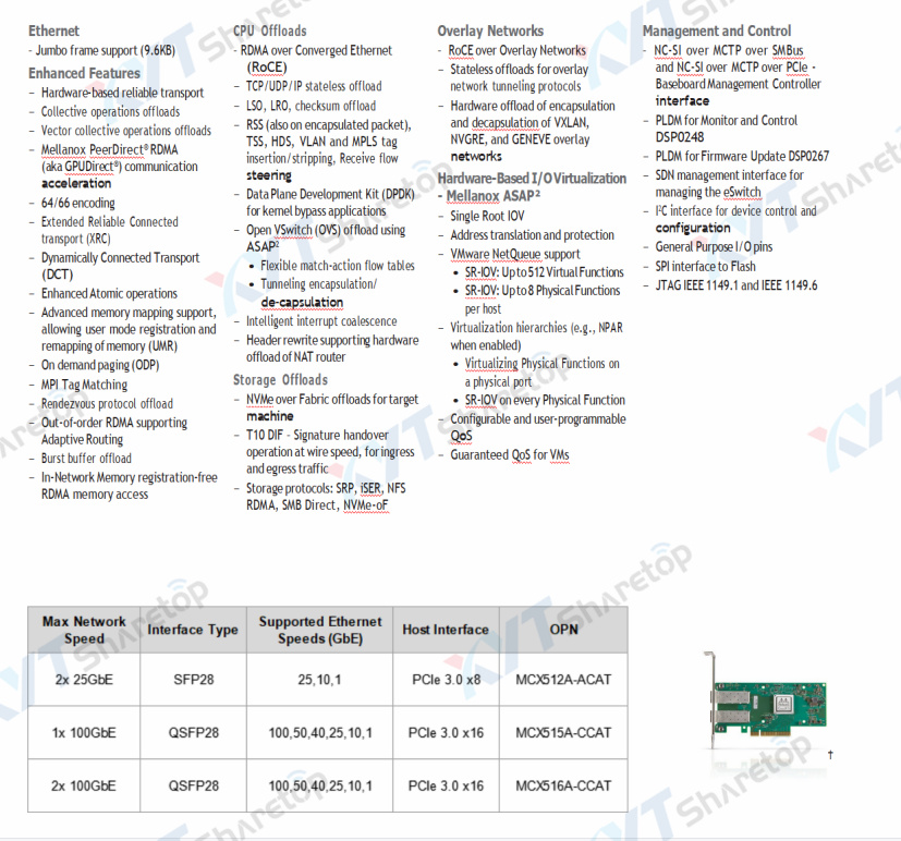 ConnectX-5 Ethernet adapter cards provide high performance and flexible solutions with up to two ports of 100GbE connectivity, 750ns latency, up to 200 million messages per second (Mpps). Forstorage workloads, ConnectX-5 delivers a range of innovative accelerations, such as Signature Handover (T10-DIF) in hardware, an embedded PCIe Switch, and NVMe over Fabric target offloads. ConnectX-5 adapter cards also bring advanced Open vSwitch offloads to telecommunications and cloud data centers to drive extremely high packet rates and throughput with reduced CPU resource consumption, thus boosting data center infrastructure efficiency.
