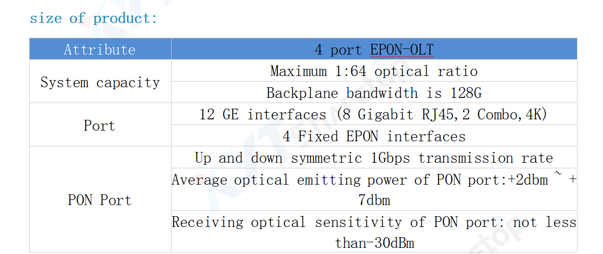 The 4-port EPON-OLT is an OLT device that follows the IEEE802.3ah and the People's Republic of China Communications Industry Standards (YD/T 1475-2006), fully supporting CTC2.0/2.1, auto discovery and being compatible with each vendor ONU.Build a highly efficient EPON solution.The 4-port EPON-OLT supports PON transmission rates of 1.25Gbps, efficient bandwidth utilization, and Ethernet business support capabilities to help operators provide reliable business quality assurance for their users.The optical ratio of 1:64 supports the hybrid network of different types of ONU, minimizing the investment of operators.The 4-port EPON-OLT uses industry-advanced technology, with powerful features and QoS assurance in the Ethernet business, with SLA and DBA support.