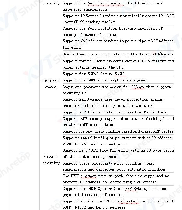 5.Perfect security protection mechanism, adopts hardware-based package by packet forwarding, can effectively detect and filter feature messages, support ARP attack based on MAC address, automatic protection and automatic user blocking function, and prevent the attack of protocol messages.Support various anti-DDoS, CPU overload protection and VRRP and other equipment protection functions, to prevent illegal or abnormal traffic into entering the network, to resist a variety of virus attacks, to ensure the safety of equipment management.