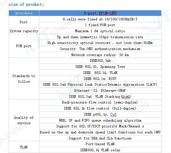 The 8-port EPON-ONU device is an MDU device that follows IEEE802.3ah and the Communication Industry Standards of the People's Republic of China (YD/T 1475-2006), integrating Ethernet switch function and optical network unit ONU function, and can be organically integrated with XYT’s OLT products to form an efficient EPON solution.Can very well meet the application of radio and television two-way network, operator FTTO/FTTB.