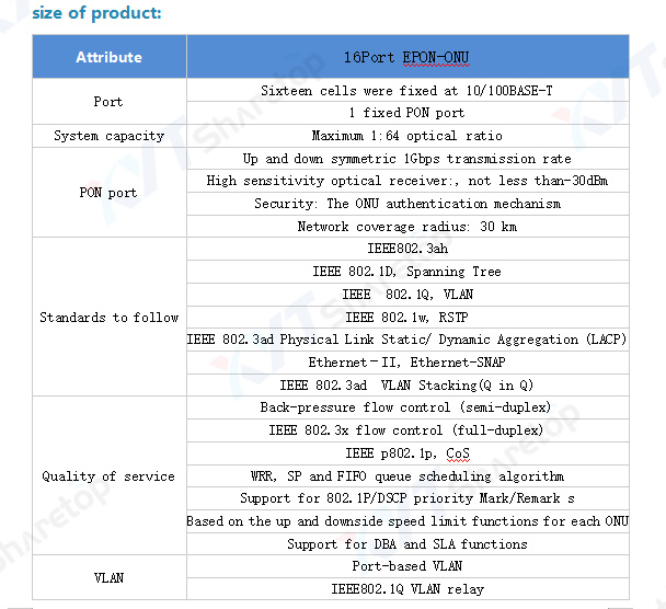 The 16-port EPON-ONU device is an MDU device that follows IEEE802.3ah and the Communication Industry Standards of the People's Republic of China (YD/T 1475-2006), integrating Ethernet switch function and optical network unit ONU function, and can be organically integrated with XYT’s OLT products to form an efficient EPON solution.Can very well meet the application of radio and television two-way network, operator FTTO/FTTB.