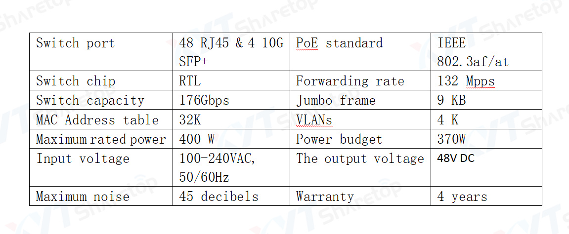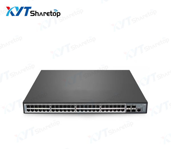 XYT-3400-48T4SP managed PoE + Ethernet switch is equipped with 48x10/100/1000Base-T RJ45 Ethernet ports, 1 console port, and 4 10G SFP+ slots. PoE Gigabit switches can supply power to network devices, such as wireless access points (AP), IP cameras, and IP phones. It is compact, plug-and-play and requires no configuration, which is convenient for management and maintenance. This managed PoE+ switch has a high degree of flexibility. The transmission distance of the SFP+ optical fiber port can be as long as 120km, and it has a high anti-electromagnetic interference capability.