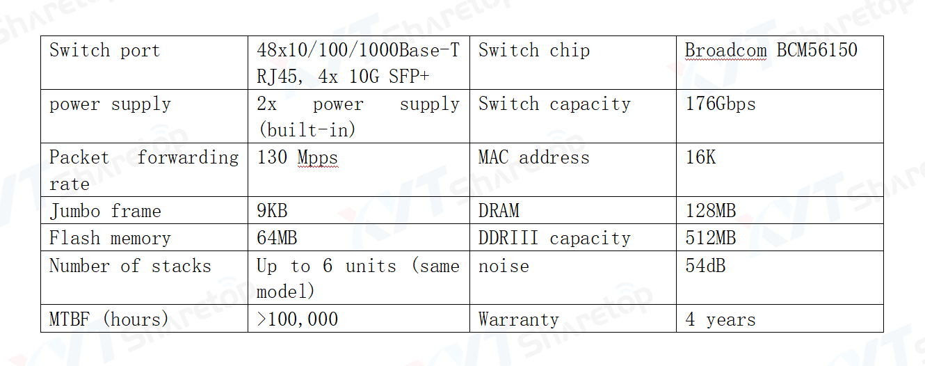 The XYT-3900-48T4S switch is equipped with 48*10/100/1000BASE-T+ 4*10G uplink ports and dual power supplies. It has the characteristics of high availability, high security business operation, high sustainability and borderless network experience. Equipped with 1G and 10G bit ports and advanced QoS to the edge network for easy management. Up to 6 switches of the same model can be stacked.