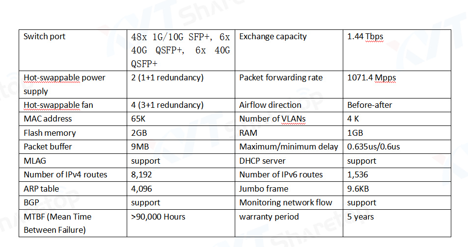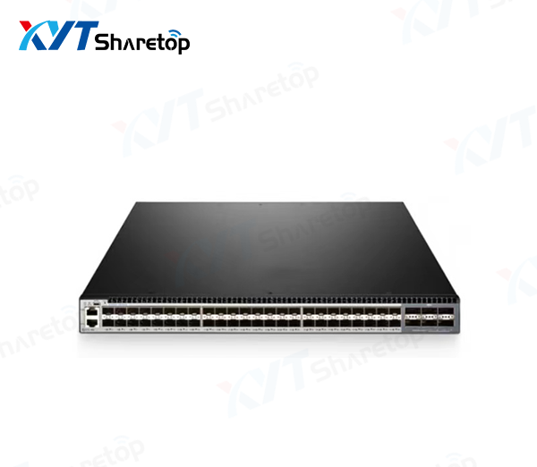 XYT-5850-48S6Q convergence layer switch is equipped with 48 10G SFP+ ports and 6 40G QSFP+ uplink ports. The 10G SFP+ port is used for the access layer device connection, and the 40G optical port is used for the uplink core switch. The hot-swappable power supply can be replaced without turning off the power, and the hot-swappable fan can automatically adjust the fan speed to reduce equipment energy consumption. The cross-device link aggregation function combines two switch devices into an M-LAG dual-active system to synchronize information, improve link reliability to the device level, and simplify the network and configuration.