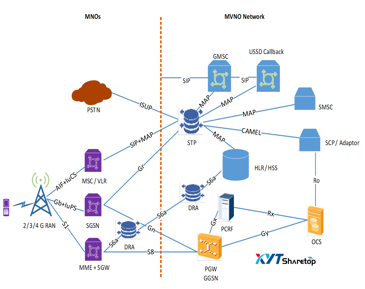 XYT technology team can provide high-quality services from product R & D, project scheme design to the world. The following is the network system architecture diagram of xianyitong technology 3G / 4G virtual operator: