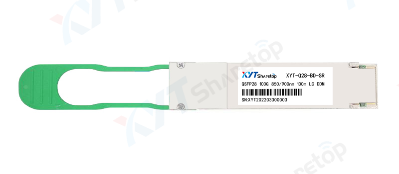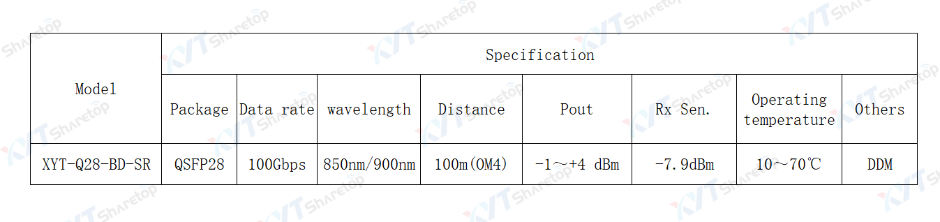 The XYT-Q28-BD-SR launched by SHARETOP is a multi-mode optical module for 100Gb Ethernet, which is a high-performance module for short-distance data communication and interconnection applications. It integrates four electrical signals at 25 Gb/s in each direction into two 50 Gb/s optical signal channels, providing an aggregate bandwidth of 100 Gb/s, operating at 850 nm and 900 nm nominal wavelengths , support hot swap. The module adopts the proven integrated circuit and VCSEL technology, which can effectively guarantee the long life and high performance of the optical module.