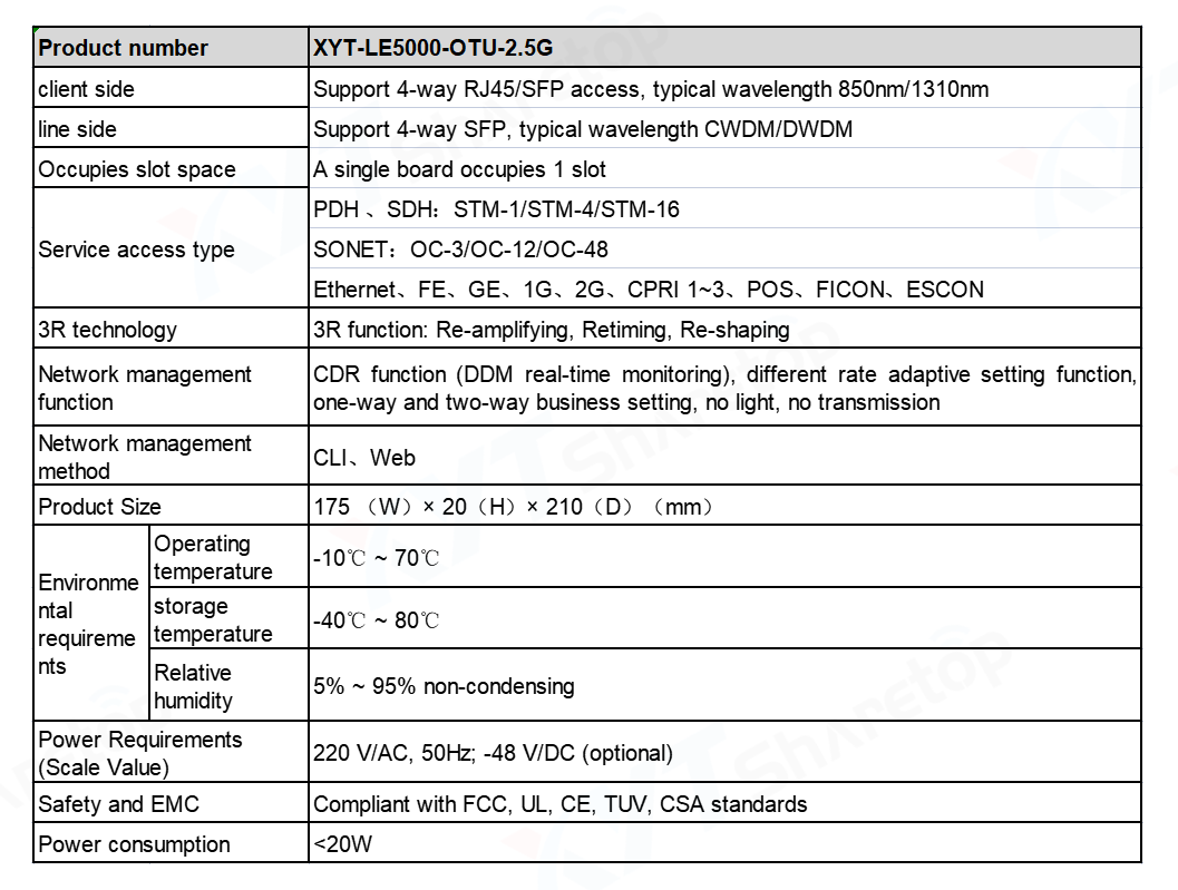 The 2.5G OTU board (XYT-LE5000-OTU-2.5G) is a functional board for service access. input, and perform 3R signal regeneration, and can monitor each service optical signal at the same time. Widely used in metropolitan area network construction, government and enterprise private network construction, and data center interconnection.