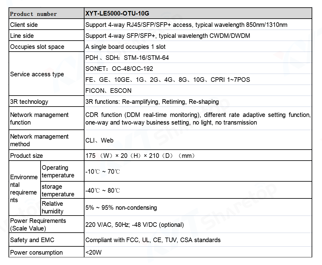 10G OTU board (XYT-1600-OTU-10G) is a functional board for service access. The board is powerful and can realize service access to any rate protocol from 1.25Gbit/s to 11.3Gbit/s , and perform 3R signal regeneration, and can monitor each service optical signal at the same time. Widely used in metropolitan area network construction, government and enterprise private network construction, and data center interconnection.