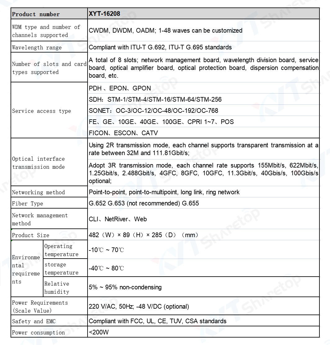 XYT-16208 series product is an active wavelength division system that supports multiple service access. The system has high service integration, high port density, flexible configuration and large transmission capacity.