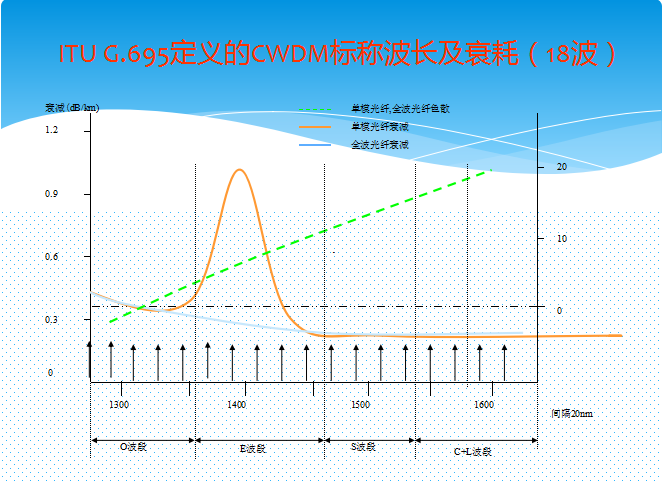 As show in picture 2,though ITU G.695 customized CWDM O、E、S、C、L five wavelength total 18 wavelength,However, due to the current metropolitan area laying too much for G652, G655 fiber in the E-band there is a "water peak",Resulting in light transmission in this band when the window is too much attenuation, the business can not normally operate。The new "full-wave" fiber eliminates the "water peak" near the 1400-nm E-band,,The attenuation of 18 wavelengths is relatively smooth, allowing CWDM to transmission more business。So now CWDM 1470nm ~ 1610nm a total of eight wavelength is wildly used in transmission business.