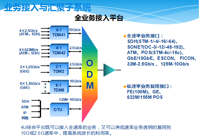 ① excellent performance, long distance transmission, large capacity architecture, highly integrated design, smooth upgrade expansion, comprehensive and perfect protection, rich business access, intelligent control plane, economic energy.