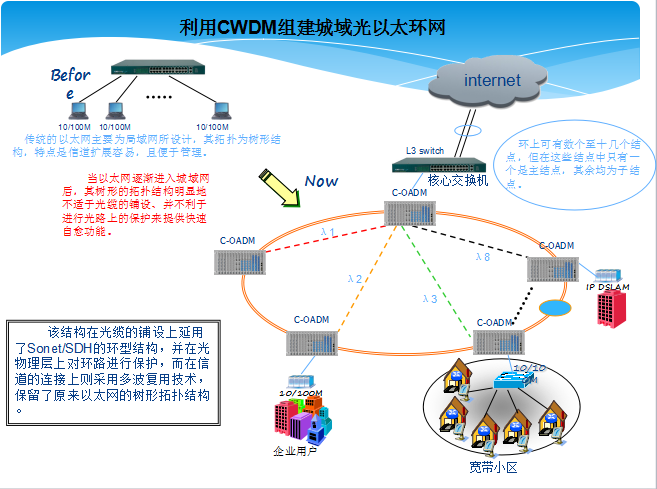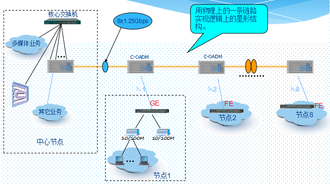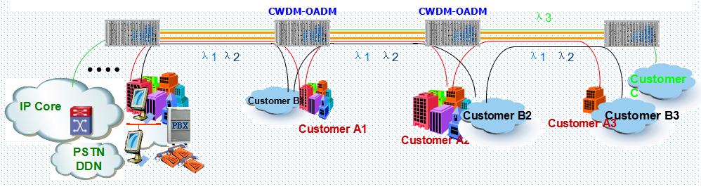 Use CWDM rental wavelength to solve the big customer application program,As shown in Figure 10. In the figure, each service node is distributed on the extension line of the optical fiber line, and the fiber resources of each node to the central node are saved by CWDM, and different wavelengths and exclusive bandwidths are used among the nodes, and each wavelength can carry the service Including 100M, GE, 10GE IP business, 155M / 622M / 2.5G POS business and other 1.25G following rate of business. Wavelength leasing use of this can be widely used, the advantage is: to save fiber resources, you can quickly carry out new business; different wavelengths of information isolation, good security performance; business upgrades easy, single wavelength can carry a rich business type, You can upgrade your bandwidth from 100M to 1000M or 2.5G without any changes to your device.