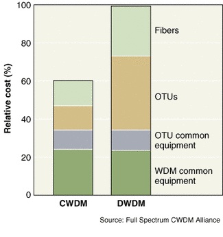 Coarse WDM technologies have actually been in use since the early 1980s, primarily in 850-nm multimode local area network (LAN) applications.1 But in the late 1990s, spurred by increasing bandwidth demands and a growing need to ease data traffic bottlenecks in metro, access, and enterprise networks, carriers began turning to CWDM as a lower-cost alternative to DWDM for a broad range of multipurpose, multimode applications, including local-, wide-, and storage-area networks. According to various market reports, the estimated cost savings of CWDM systems over DWDM systems varies from 35% to 65% .