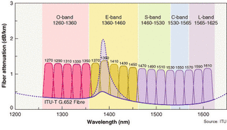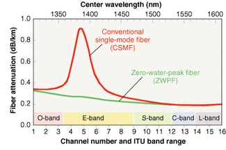 One of the most important technological advances contributing to the adoption of CWDM has been the development of low- and zero-water-peak fiber (ZWPF). Conventional single-mode fiber suffers from excess water-peak attenuation between 1350 and 1450 nm, making this band unusable for signal transmission (see Fig. 4). In addition, single-mode fiber can carry only 12 channels or less, depending on the tail of the water peak and excess hydrogen aging loss over time.