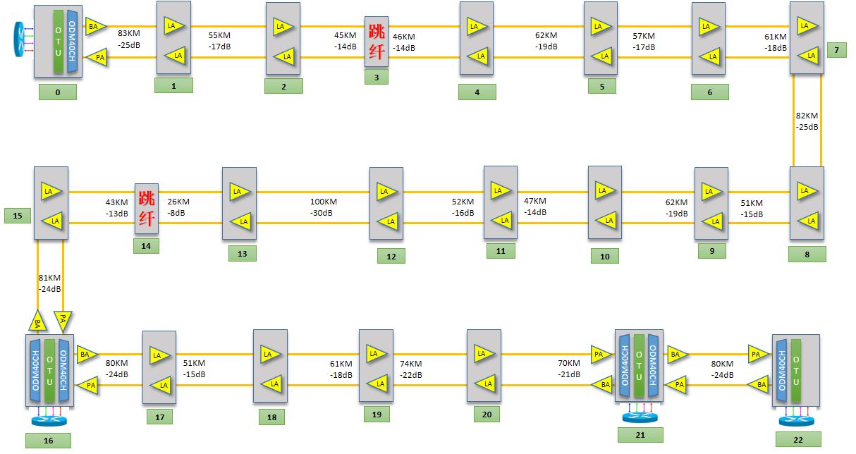 As shown above, the customer's total line is more than 1000 kilometers, and it is necessary to transmit 2T traffic. Later, it needs to be expanded to 4T. Based on customer needs, Fiber Yitong provides the relevant optical single wave 100G+ wavelength division technical solution. Configure 40-channel WDM and 100G coherent optical modules, and only need to do LA light compensation in the middle.