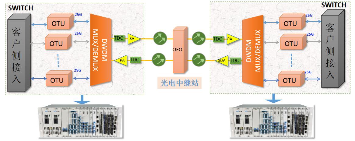 As shown above, the customer's total line is 150 kilometers, and it needs to transmit about 1T of traffic. Fiber Yitong provides non-correlated optical single wave 25G+ wavelength division technology according to customer needs. Configure 40-channel WDM and 25G uncorrelated optical modules for optical compensation and dispersion compensation.