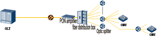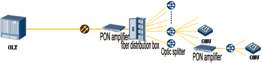 The PON remote amplifier is deployed between the OLT and the optical splitter or between the ODN and the ODN to improve the optical power and transmission distance of the line, improve the utilization of the PON port (split ratio), and extend and expand the branch.